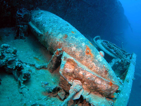 Arriviamo vicino al cannone dove, la barrierra corallina non ha potuto occultare la postazione di fuoco con ben visibili il seggiolino e il poggia schiena. Alla visione di tutto questo un brivido percorre il mio corpo e comprendo che tutto ciò è una testimonianza della storia, ora incapace di nuocere ad alcuno , ma comunque e sempre uno strumento di morte e distruzione.