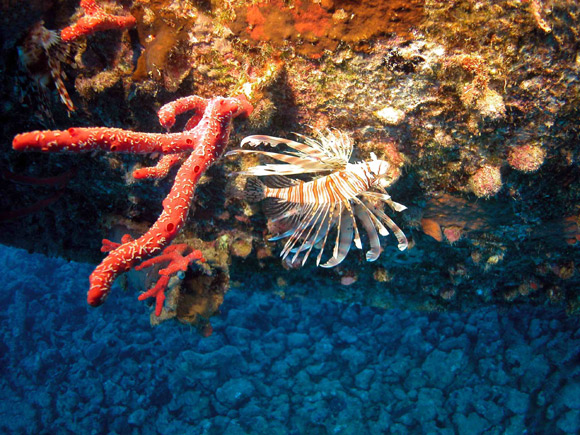 Nella parte prodiera un immenso nuvolo di glass fish protegge le strutture dai nostri sguardi curiosi, mentre un piccolo , ma coraggioso lion fish funge da difensore, pronto ad attaccare chiunque si avvicini alla sua postazione.