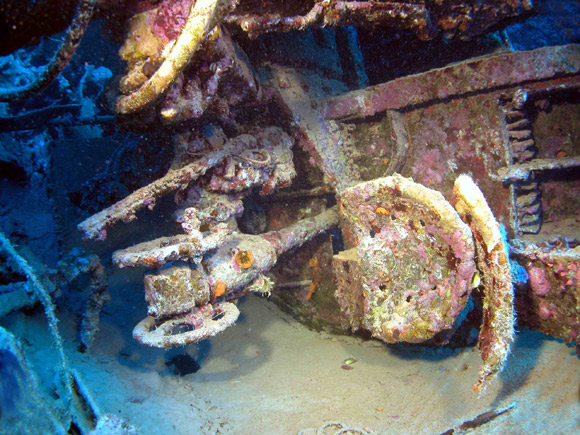 Dall’ossatura delle fiancate fuoriescono , quasi a voler svolgere ancora la loro funzione originaria le canne delle mitragliere antiaeree e la grossa canna di un cannone. Il fumaiolo , chiaramente distinguibile si trova al centro del ponte e sovrasta l’intero scafo da poppa a prua. Sulla sua superficie evidentemente visibili gli scalini, totalmente puliti da ogni incrostazione.
