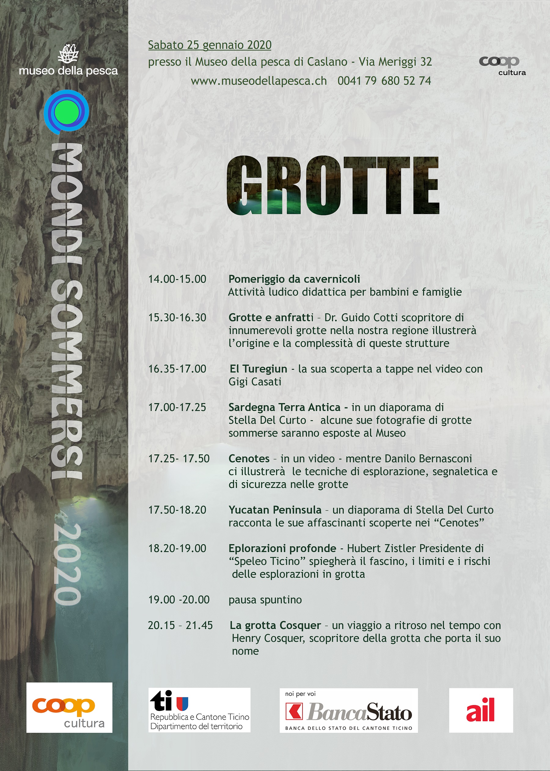 L’appuntamento, promosso con il sostegno di Coop Cultura, del Dipartimento del Territorio, di Banca Stato e delle Aziende industriali di Lugano (AIL), avrà come protagoniste le grotte che verranno presentate al pubblico da Stella del Curto, istruttrice e fotografa subacquea di Ascona, dal dottor Guido Cotti “padre” del Museo cantonale di storia naturale di Lugano e autore di moltissime pubblicazioni scientifiche, da Danilo Bernasconi, recordman di permanenza sott’acqua e di profondità (50 ore 6 minuti nel 2013 e -220 metri nel 2016, nel Lario) da Hubert Zistler presidente di Speleo Ticino, da Henry Cosquer scopritore nel 1991 della grotta nel sud della Francia che porta il suo nome e da Luigi Casati speleonauta di Lecco.