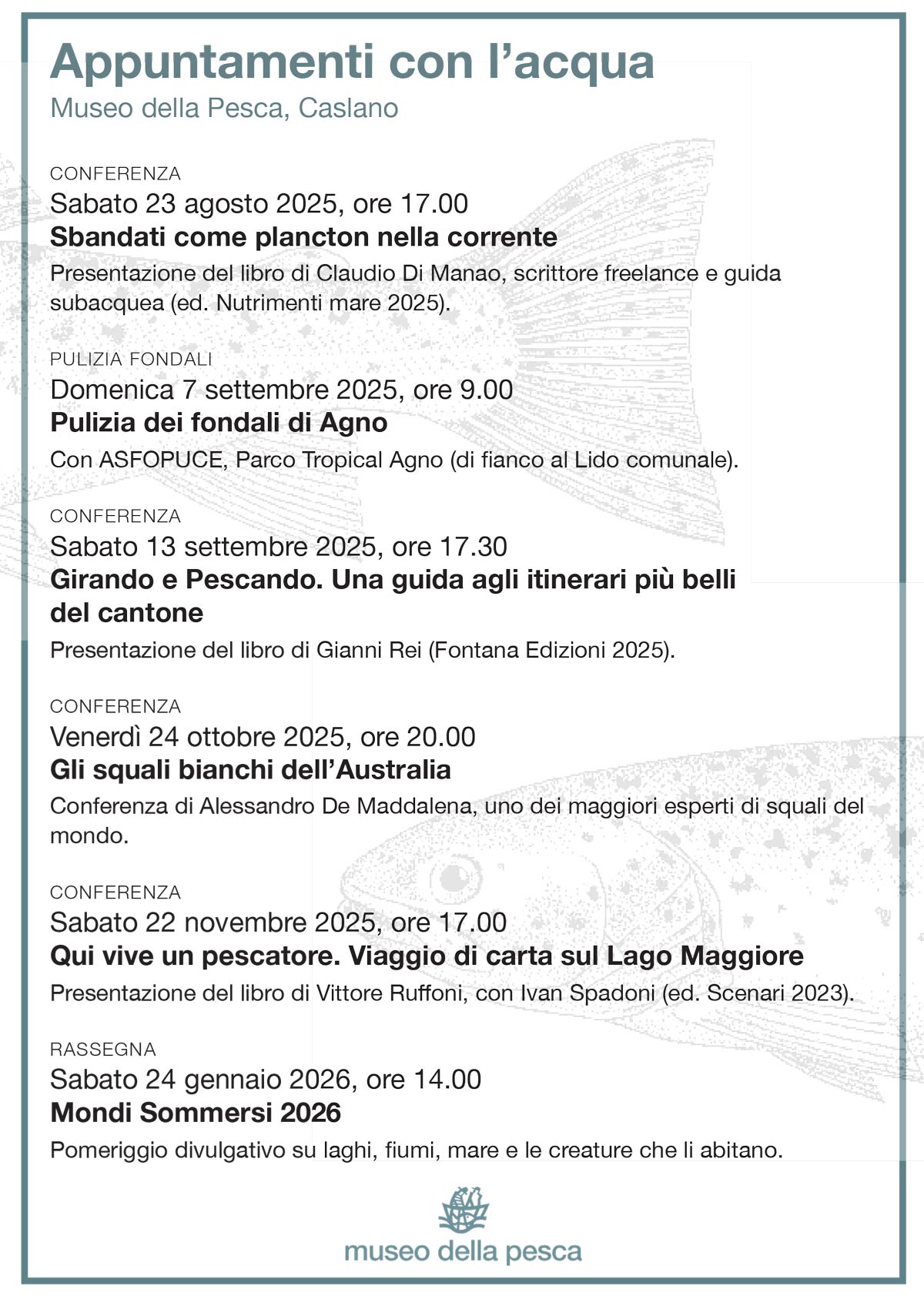 Il Museo della pesca di Caslano raccoglie e conserva oggetti, strumenti e testimonianze delle tradizioni di pesca locali. L’attività museale non si limita all’esposizione: la missione è trasmettere la cultura della pesca e diffondere il rispetto degli ecosistemi acquatici, anche attraverso mostre temporanee, conferenze, laboratori e attività didattiche per scuole e famiglie.