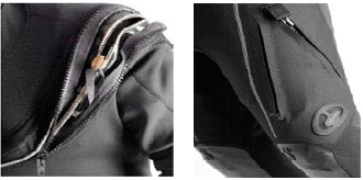 Pratico sistema di indossamento con cerniera anteriore: la cerniera stagna in bronzo chiude lo strato interno ed è protetta da una seconda cerniera in materiale plastico che chiude la fascia protettiva posta sullo strato esterno in tessuto.