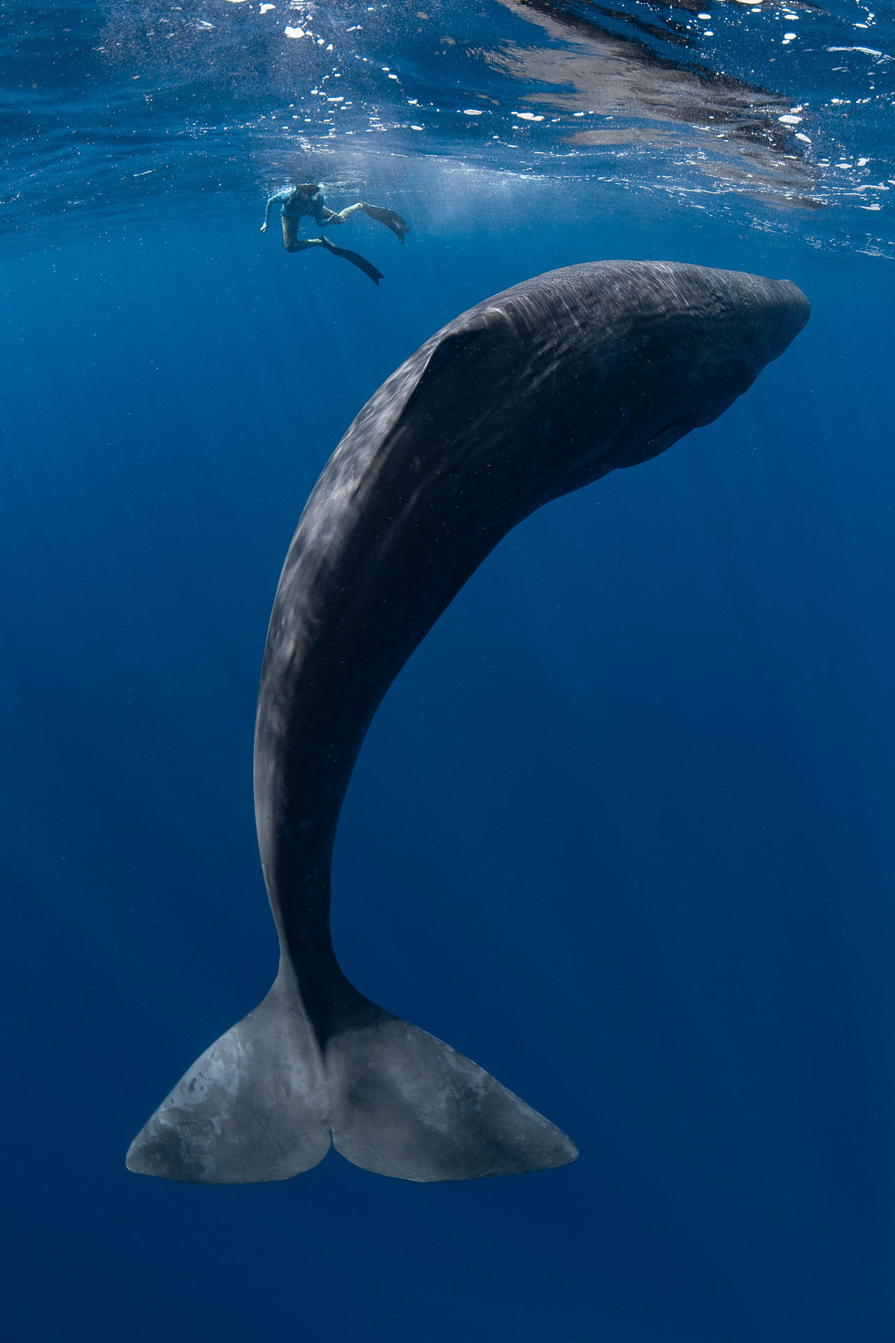 Ci dice Marco a proposito della sua foto: “Al largo di Dominica, un cucciolo di capodoglio (Physeter macrocephalus) riposa vicino a una femmina adulta, probabilmente la madre, mentre altri due membri della stessa famiglia dormono in posizione verticale poco distante.