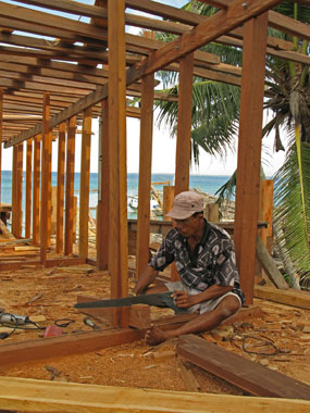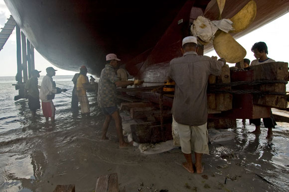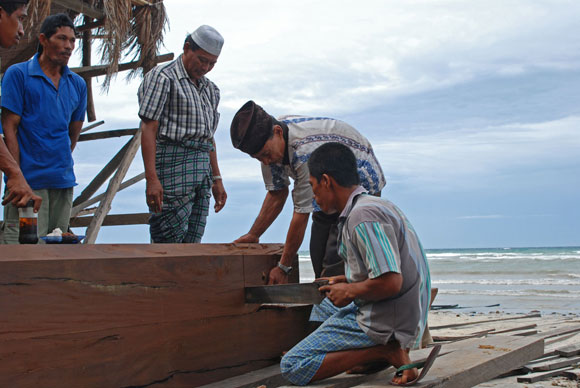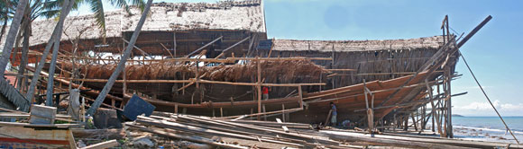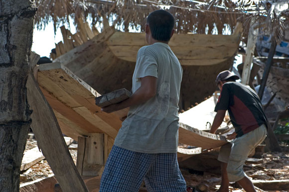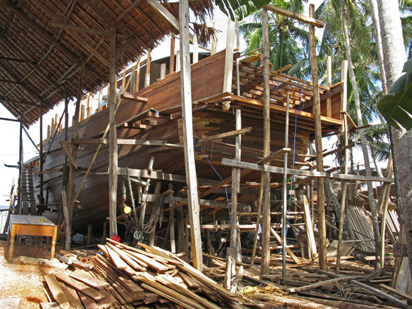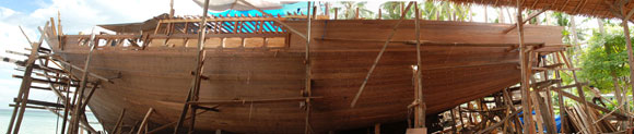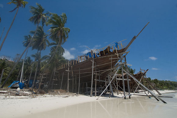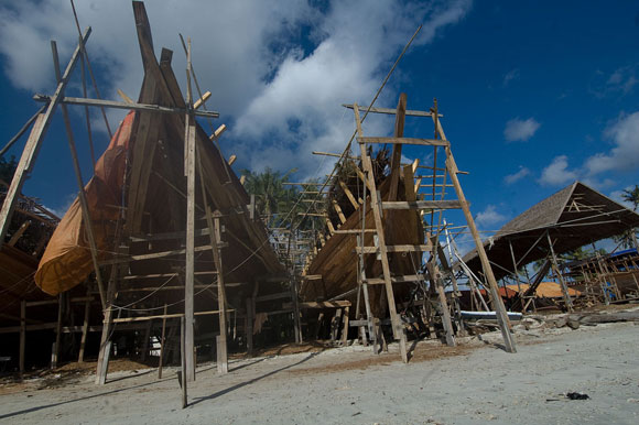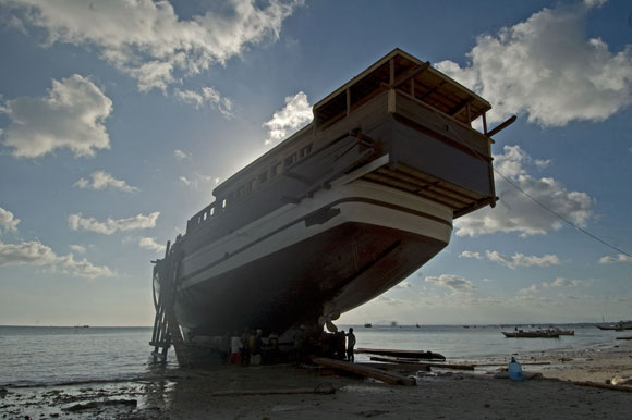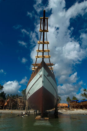 Può essere difficile credere che nel 2008 siano strumenti interamente manovrati a mano e l’occhio del capocantiere a dare forma a un sogno, che nasce come Venere su una spiaggia bianchissima, lambita dalle onde dell’Oceano, ai margini della foresta. Eppure è così: qui in Indonesia, nel più grande arcipelago del mondo, le mani dell’uomo lentamente, con azioni precise, ritmate e sempre uguali da tempi antichissimi, danno forma al legno della foresta, uno dei beni più preziosi di queste terre, trasformandolo in nave.
