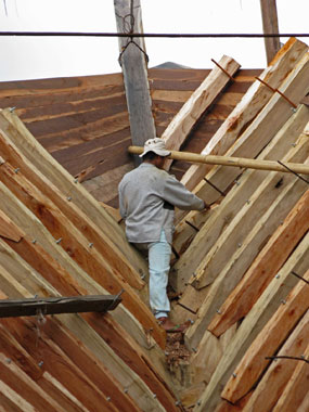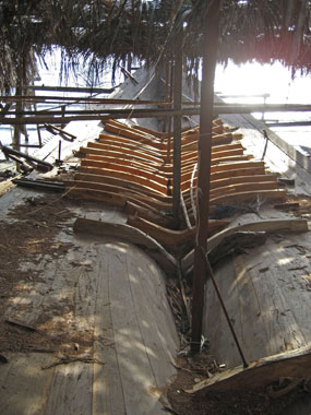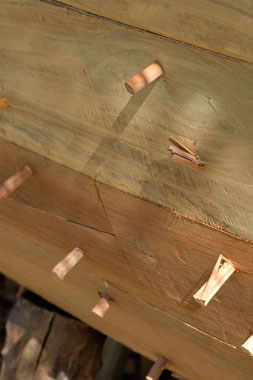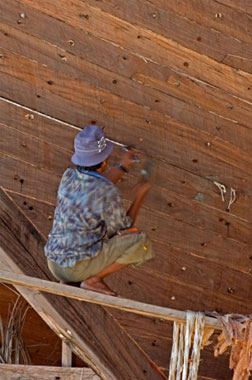 Foto a sinistra: I perni (pasak) sporgono dal fasciame, in attesa di essere tagliati.