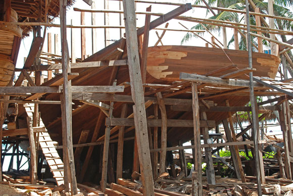“La nave nasce nella foresta. Il primo passo è la scelta della chiglia (lunas): un pezzo unico, un asse lungo 25 m e spesso 60 cm, deve venire da un unico albero, darà la forza per resistere all’impatto dei marosi. La costruzione inizierà solo dopo aver trovato l’asse giusto per la lunas. Poi a fianco si mettono le assi del fasciame, una accanto all’altra, e le murate prendono forma. Solo a questo punto si aggiungono le ordinate. Voi europei le mettereste per prime, le ordinate, qui in Asia si fa all’opposto, e la cosa funziona, da sempre”.