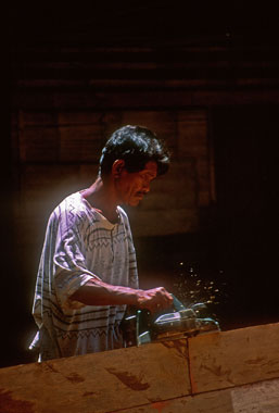 E la tradizione si riaffaccia prepotente nelle cerimonie del potong lunas (il taglio della chiglia, che segna l’inizio della costruzione) e del varo, sottolineate da offerte e da riti che conservano un che di pagano e misterioso, dove l’aroma del té e degli incensi si mescola all’odore del legno tagliato e a quelli più prepotenti degli oli usati per impermeabilizzarlo.