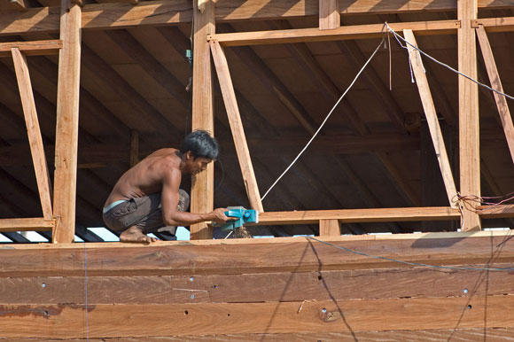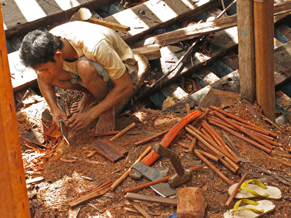 Un asse del fasciame di una piccola barca viene messa in posizione. Sono solo i perni di legno (pasak) a tenerla insieme, per ora.