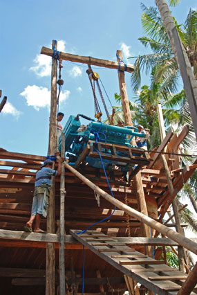 Foto a sinistra: Un momento importante, il motore viene issato a bordo (ovviamente a mano) per essere calato nella sala macchine.