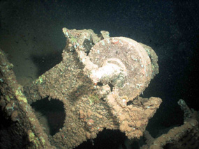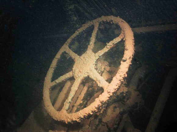 Nonostante la limpidezza dell’acqua non riesco a distinguere la fine dello scafo, lungo circa 150 metri e il mio sguardo si perde nel blu; il grande monumento del mare è appoggiato su un fianco su un fondale di sabbia bianca che vedo distintamente sotto di me , il sole avvolge interamente lo scheletro della nave che può essere visitato nella sua totalità dai subacquei immune dal buio delle profondità abbissali.Lungo i numerosi ponti la luce entra con prepotenza dai grandi spazi aperti per poi trovare un altro punto d’uscita creando dei giochi di luce che esaltano maggiormente le numerose concrezioni di corallo sparse lungo la lamiera.Continuiamo la perlustrazione , notiamo le numerose cabine con i servizi chiaramente riconoscibili, i rubinetti intonsi. Lungo i ponti si vedono numerosi argani, maniche a vento e due pale dell’elica di rispetto che mi sovrastano completamente nella loro altezza.Ovunque c’è vita, una vita microscopica che si perde negli immensi spazi di questo gigante del mare.