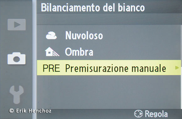 Gestire manualmente il bilanciamento del bianco con Nikon 1 J1 è molto intuitivo. Nel dettaglio il menu del bilanciamento del bianco con in evidenza l’opzione di “Premisurazione manuale”.
