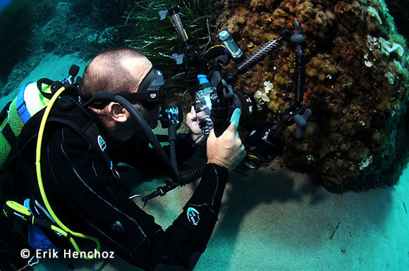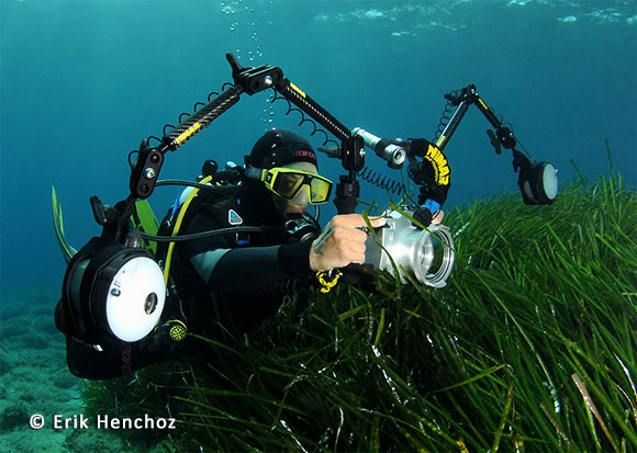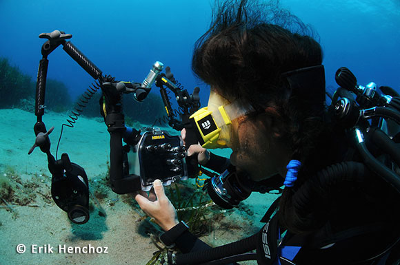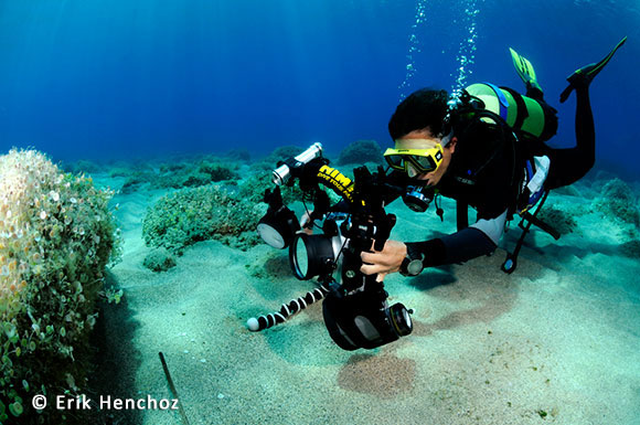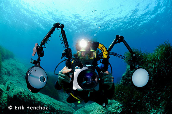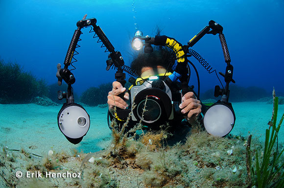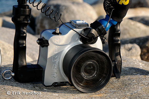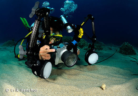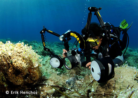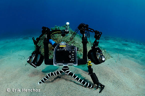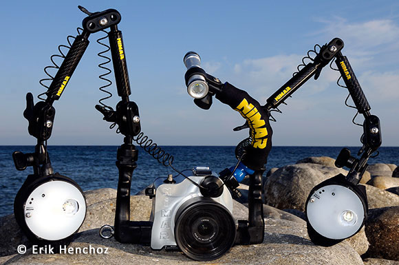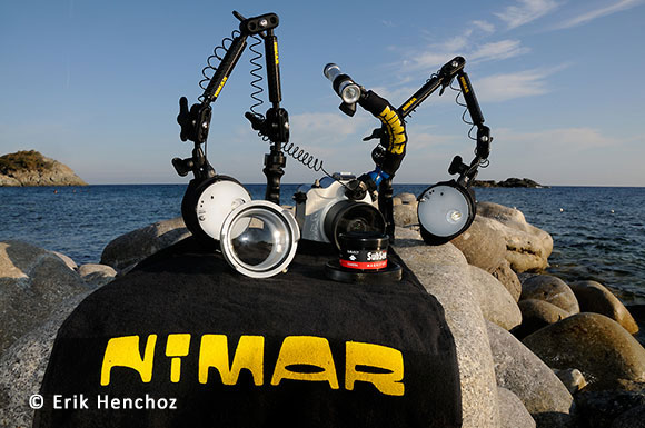 L’attrezzatura utilizzata per questo eXperience: custodia NIJ1, Nikon 1 J1, braccetti NiMar in carbonio, 2 flash INON Z240 type IV, oblò piano, oblò sferico e lente magnificatrice SubSee.