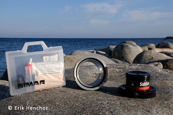 Alcuni degli accessori utilizzati. Da sinistra a destra: valigetta con Kit pulizia, oblò sferico per 1 Nikkor 10 mm F2.8, adattatore per aggiuntivo macro con lente magnificatrice Subsee +10.