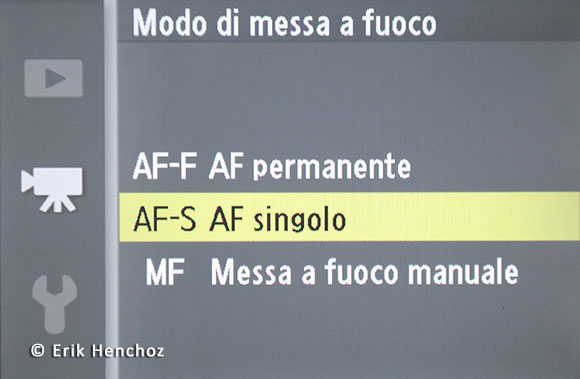 - durante le riprese video gestire al meglio il “Modo di messa a fuoco” prediligendo la modalità AF-S per riprese ravvicinate con soggetti statici.