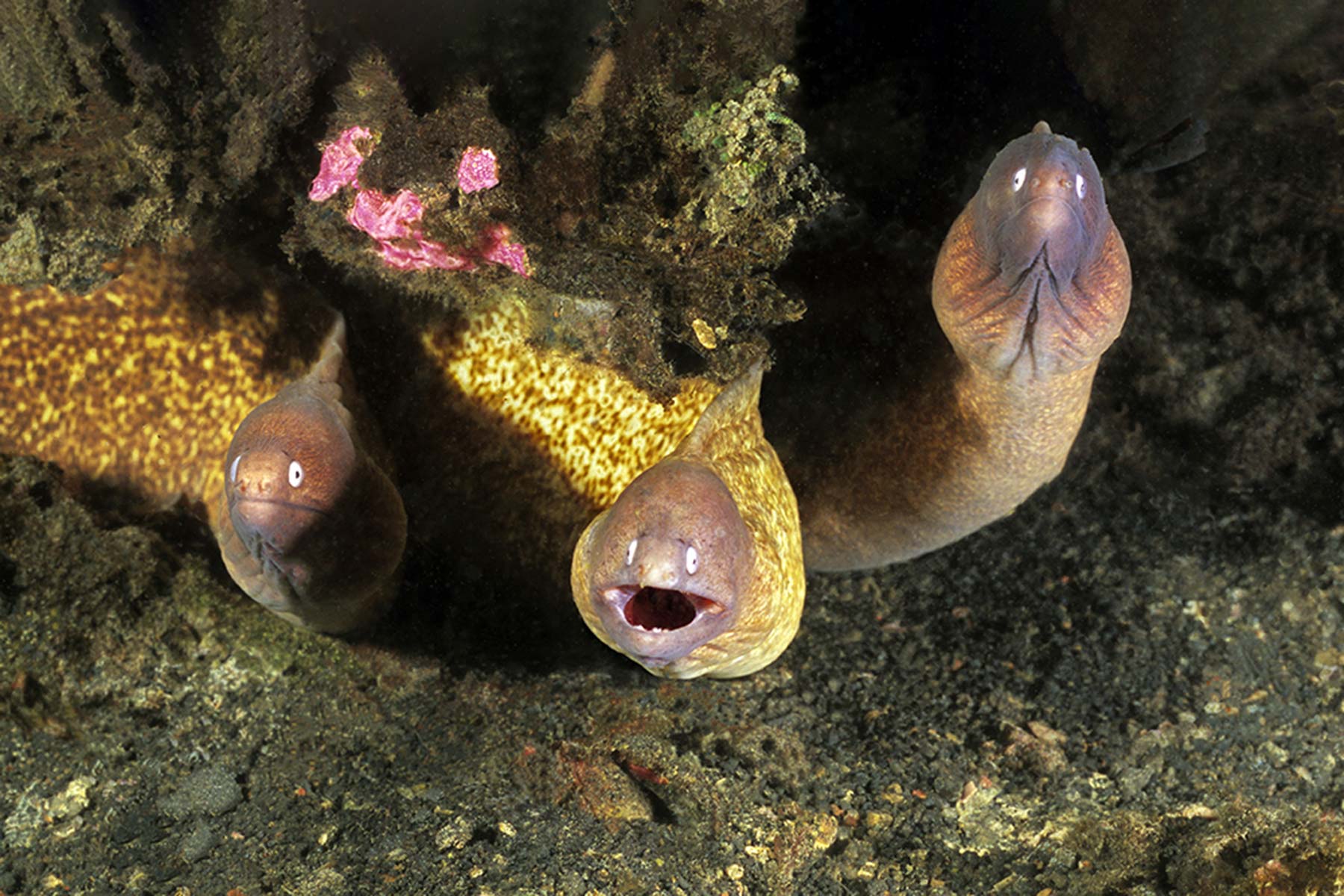 Tre pesci che formano un piccolo banco, tre sub che esplorano una grotta, oppure tre colori contrastanti (blu, rosso, giallo) creano un forte impatto visivo, valorizzando inoltre la varietà cromatica dell’ambiente marino.