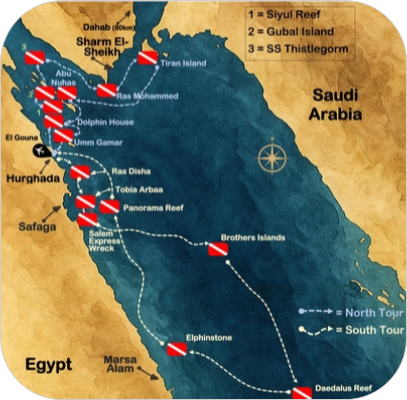 A nord, relitti leggendari come il Thistlegorm, giardini di corallo a Ras Mohammed e delfini che nuotano tra lagune cristalline.