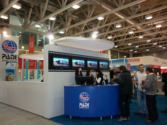 L’allestimento dello Stand PADI ricordava la struttura di un piccolo villaggio; infatti, oltre ad aqua med, ben nove tra Dive Center e Resort hanno preso parte allo show al fianco della loro organizzazione di addestramento subacqueo: Abyss Diving Service, Argos Italia, Divelandia NCM, Lionfish, Peppo Sub, Sport Diver Club, Sport Time, Taormina Diving Center e The European DC.