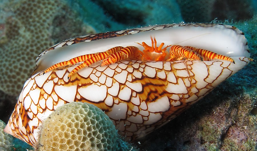 Conchiglia del genere Conus, di chi era e di chi è. Formalmente prodotta da un gasteropode (la nostra lumaca di mare) acquisita in seguito da un paguro pronto a tutto per tenersela. Guardatelo in faccia. Non sarà semplice sfrattarlo da lì.