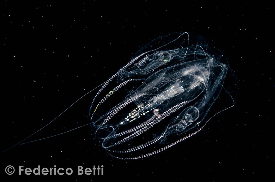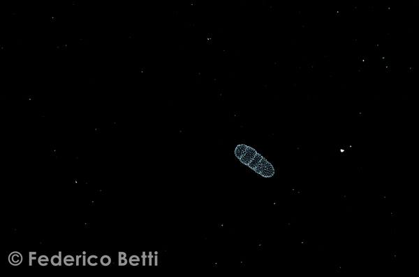 anche fissando il blu della colonna d’acqua dalla superficie: le correnti trasportano una miriade di strani animali pressoché trasparenti, a volte appena percettibili ad occhio nudo, spesso luccicanti di bioluminescenza: si tratta dello zooplancton. Questa categoria racchiude tutti gli animali viventi nella colonna d’acqua e incapaci di opporsi al moto delle correnti; va da sé che molti di essi sono così piccoli da risultare invisibili ad occhio nudo, ma anche le grandi meduse, solo per fare un esempio, non essendo in grado di contrastare la forza delle correnti ne fanno parte a tutti gli effetti. Fra gli organismi più cospicui, spiccano molti esseri di consistenza molle e aspetto traslucido, e per questo gran parte del plancton visibile è detto “macroplancton gelatinoso”. Ecco quindi che davanti ad occhi curiosi ed attenti possono passare, sospinte dalle correnti, diverse specie di meduse, la maggior parte delle quali assolutamente innocue per l’uomo; altri organismi appartenenti allo stesso Phylum, quello degli cnidari, sono i sifonofori, strani organismi che costituiscono colonie composte da centinaia o migliaia di individui, di forma medusoide con reti di lunghe estroflessioni finissime, spesso estremamente diafane con solo alcune parti ben visibili. Un noto sifonoforo è la temibile caravella portoghese, Physalia physalis, che però galleggia sulla superficie del mare e pertanto non rientra nel plancton. Molto comuni, soprattutto durante le periodiche esplosioni demografiche cui sono soggetti, possono essere anche gli ctenofori, simili a navicelle spaziali ovali o nastriformi, privi di cellule urticanti e spesso meravigliosamente iridescenti. Ci sono poi le salpe, da non confondersi con gli omonimi pesci, che sono dei tunicati e quindi tra gli invertebrati i più vicini a noi, anche se a prima vista hanno ben poco da spartire con i vertebrati: piccoli barilotti trasparenti, con una grossa macchia gialla o rossastra, spesso riuniti in lunghe catene composte da decine o centinaia di individui. Minuscoli sacchettini costituiti di tanti piccoli brillanti sono invece colonie di protozoi, organismi costituiti da una sola cellula, appartenenti al genere Collozoum.