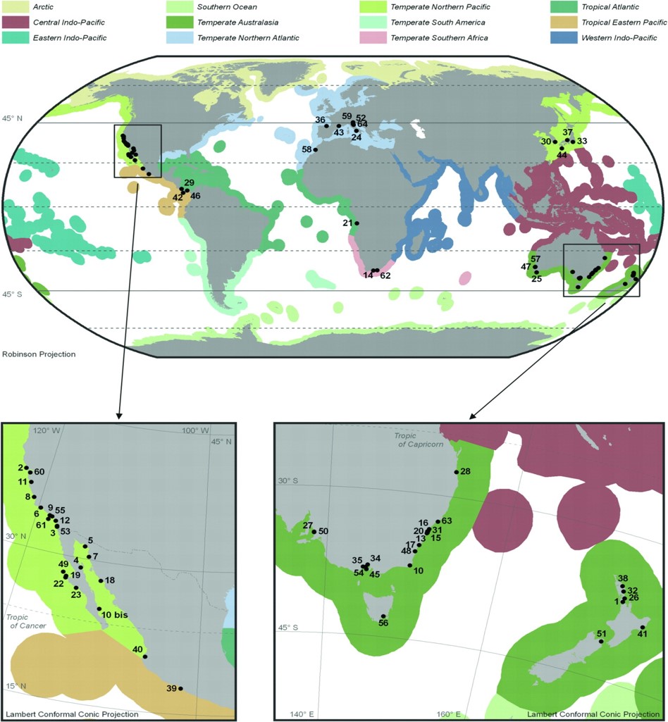La specie è associata a tutte le ecoregioni marine temperate, tranne nelle aree temperate del Sud America.
