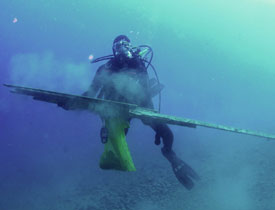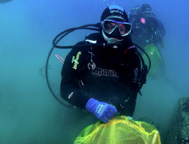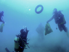 Effettuata la vestizione e un briefing approfondito rivolto ai “coordinatori”, sono stati creati dei gruppi omogenei di subacquei che sarebbero scesi a effettuare le operazioni di pulizia: per coprire il più ampio raggio possibile i sub sono stati divisi in gruppetti di cinque, supervisionati da guide esperte del sito.Armati di reticelle e di buona volontà i subacquei sono partiti a caccia di rifiuti.