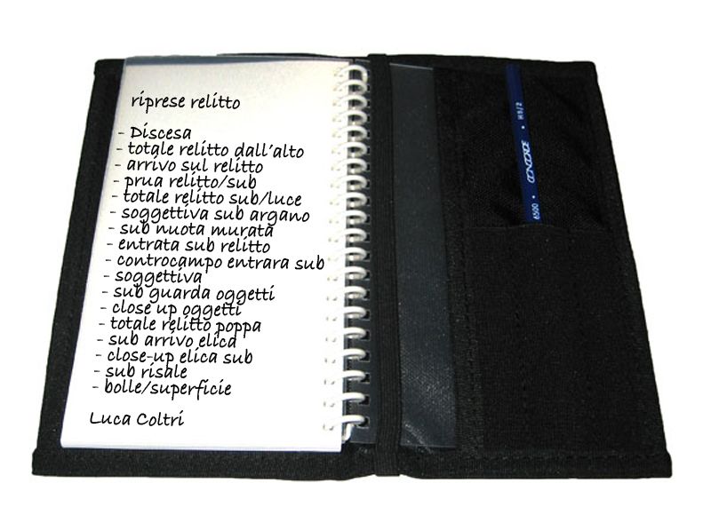 Potrà sembrare una cosa obsoleta ma io uso ancora carta e matita, mi piace abbozzare il mio racconto per sommi capi prima di iniziare, mi annoto la durata del video (stimata) di quante parti lo voglio comporre (teaser iniziale, riprese esterne, riprese sub, interviste) e quanto devono durare singolarmente ( es. in un video di 3’ magari le immagini sub sono solo 1’ e quindi so regolarmi su quanto riprendere).