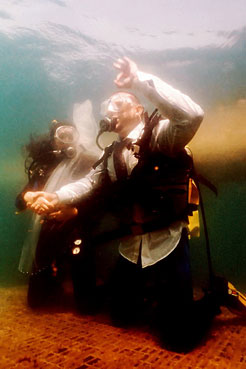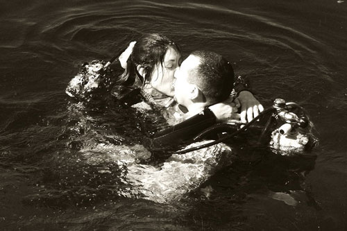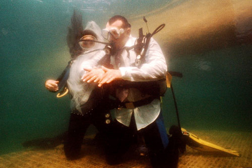 Leda ha organizzato tutto in modo eccellente con la sua creatività che la contraddistingue, e svolto la nostra cerimonia non ufficiale con una serie di cartelli plastificati che abbiamo letto e a cui abbiamo risposto con il classico ‘okey’ subacqueo fino allo scambio degli erogatori in segno di fiducia, degli anelli in segno di amore e del bacio in segno di felicità, mentre i testimoni sub incrociavano le pinne per noi. Dall’alto una pioggia di riso, lanciato da amici e parenti non subacquei rimasti in superficie ad osservare incuriositi e forse anche un po’ perplessi ma partecipi della nostra gioia. Cristian ci ha seguiti sott’acqua e ha fotografato ogni momento in modo che anche chi non c’era possa vedere cos’è accaduto in quei momenti nelle acque milanesi in cui siamo nati e cresciuti e in questa giornata abbiamo scritto un’altra bella pagina della nostra vita.