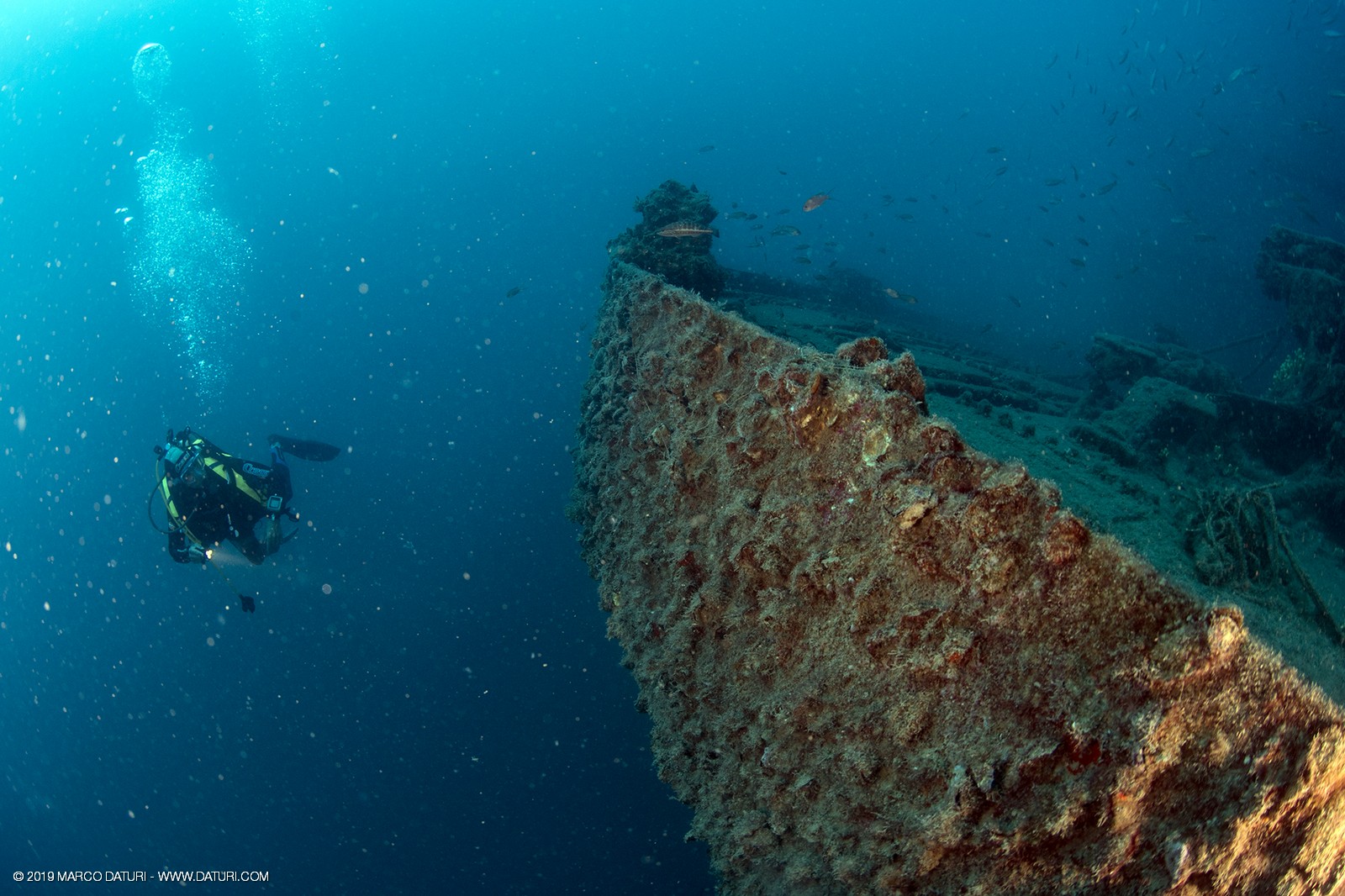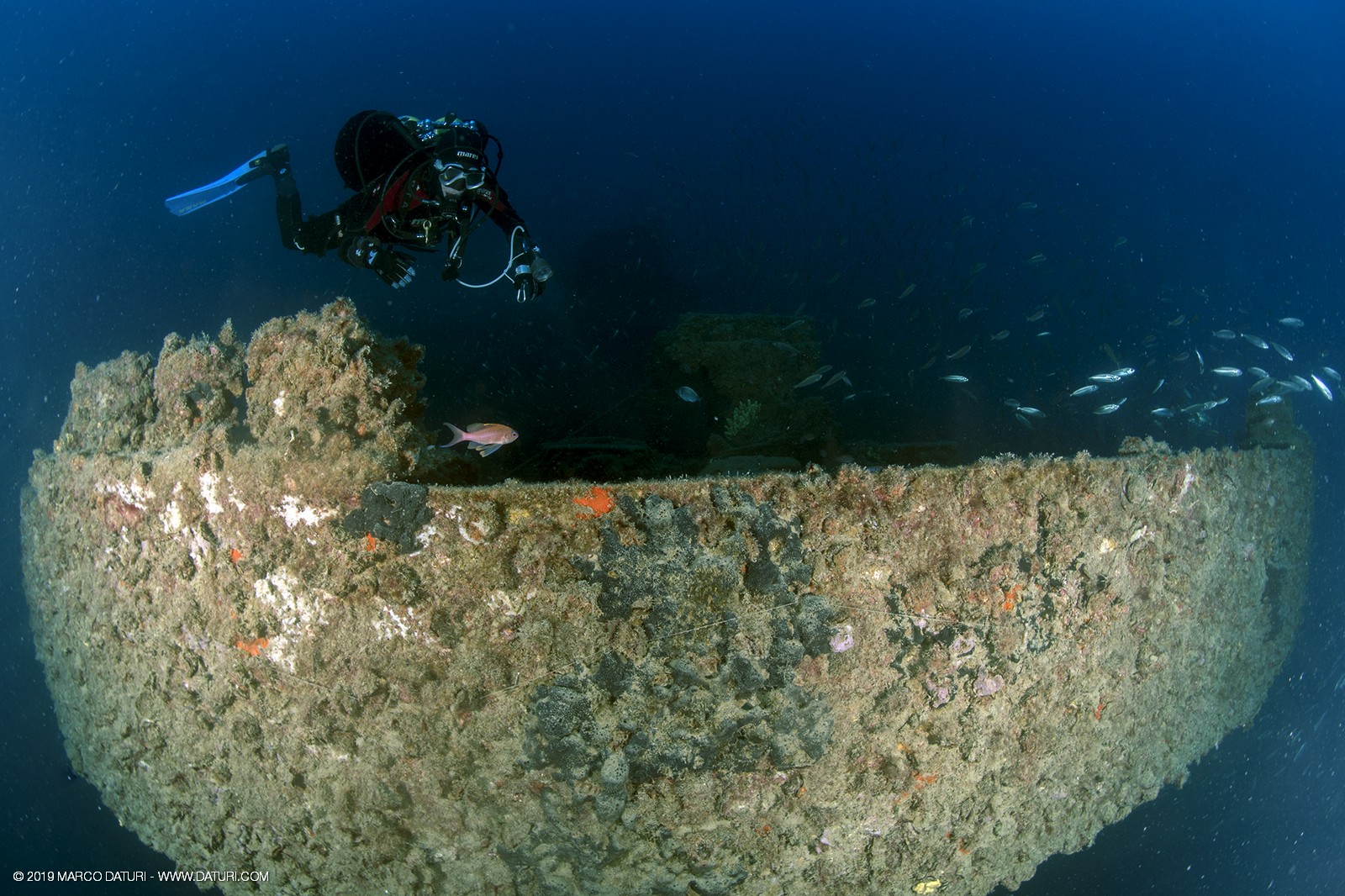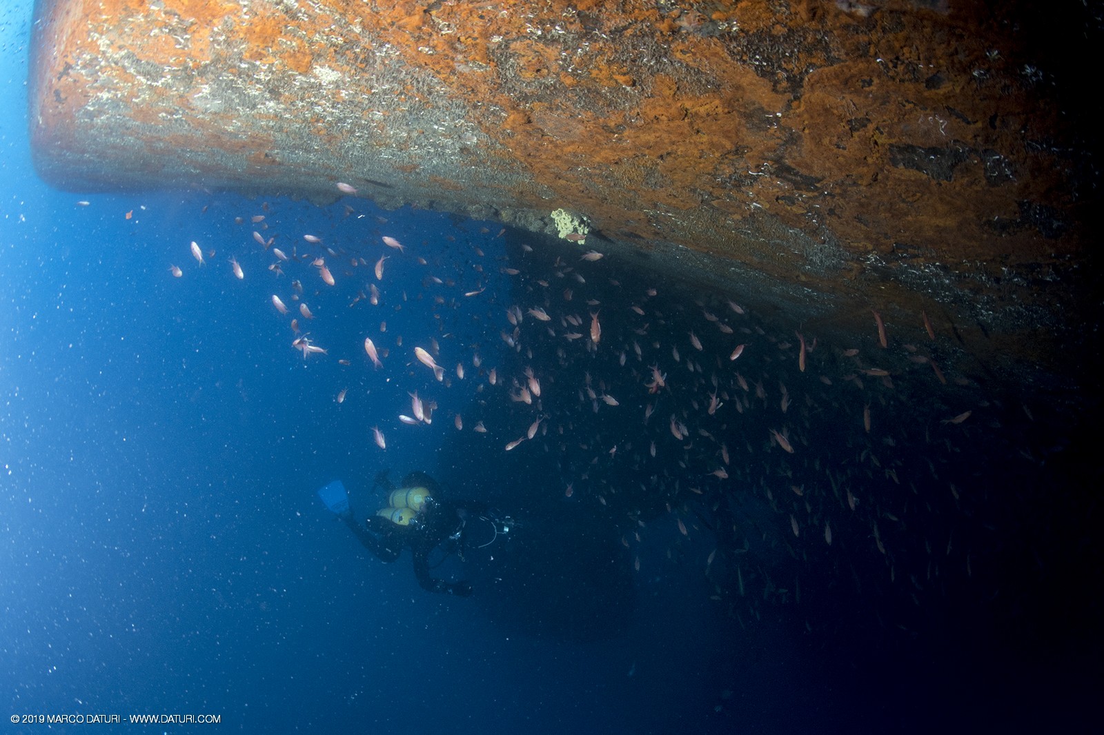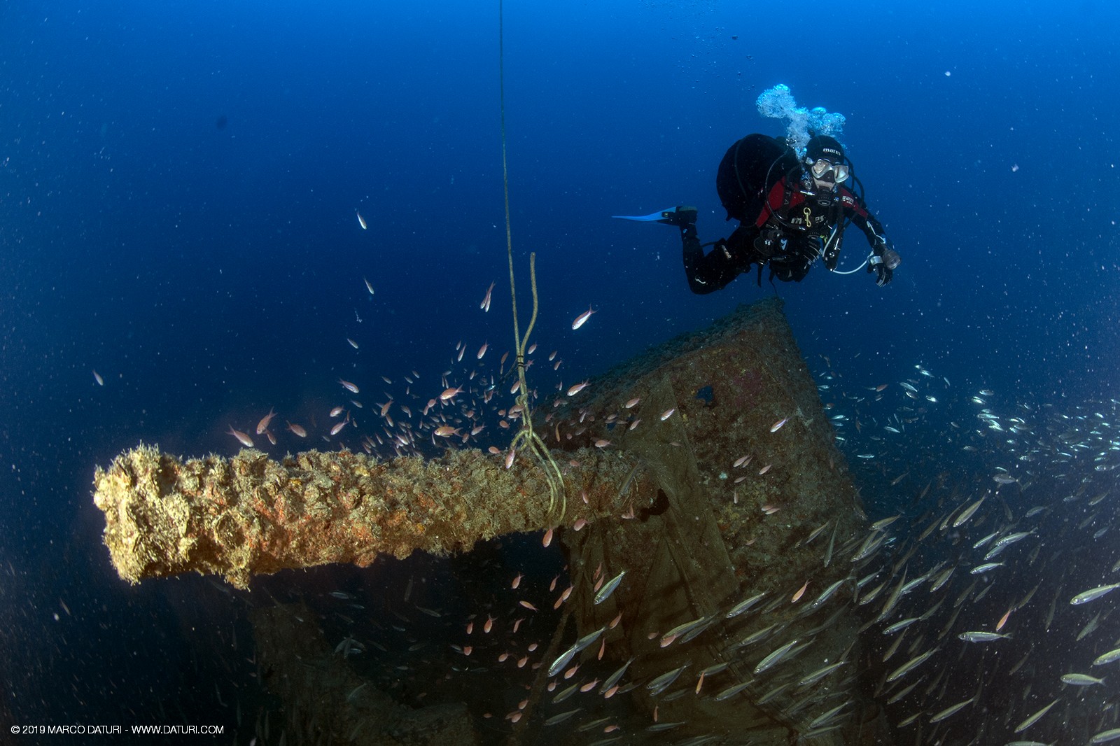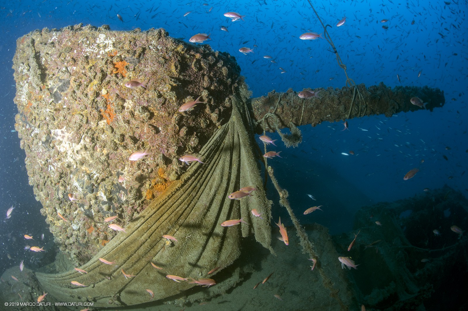 Il fascino di questo relitto distoglie l’attenzione dalla vita che ora lo anima: nuvole di anthias, murene, gronghi, aragoste, astici, nudibranchi, granchi facchino, c’è veramente di tutto!!