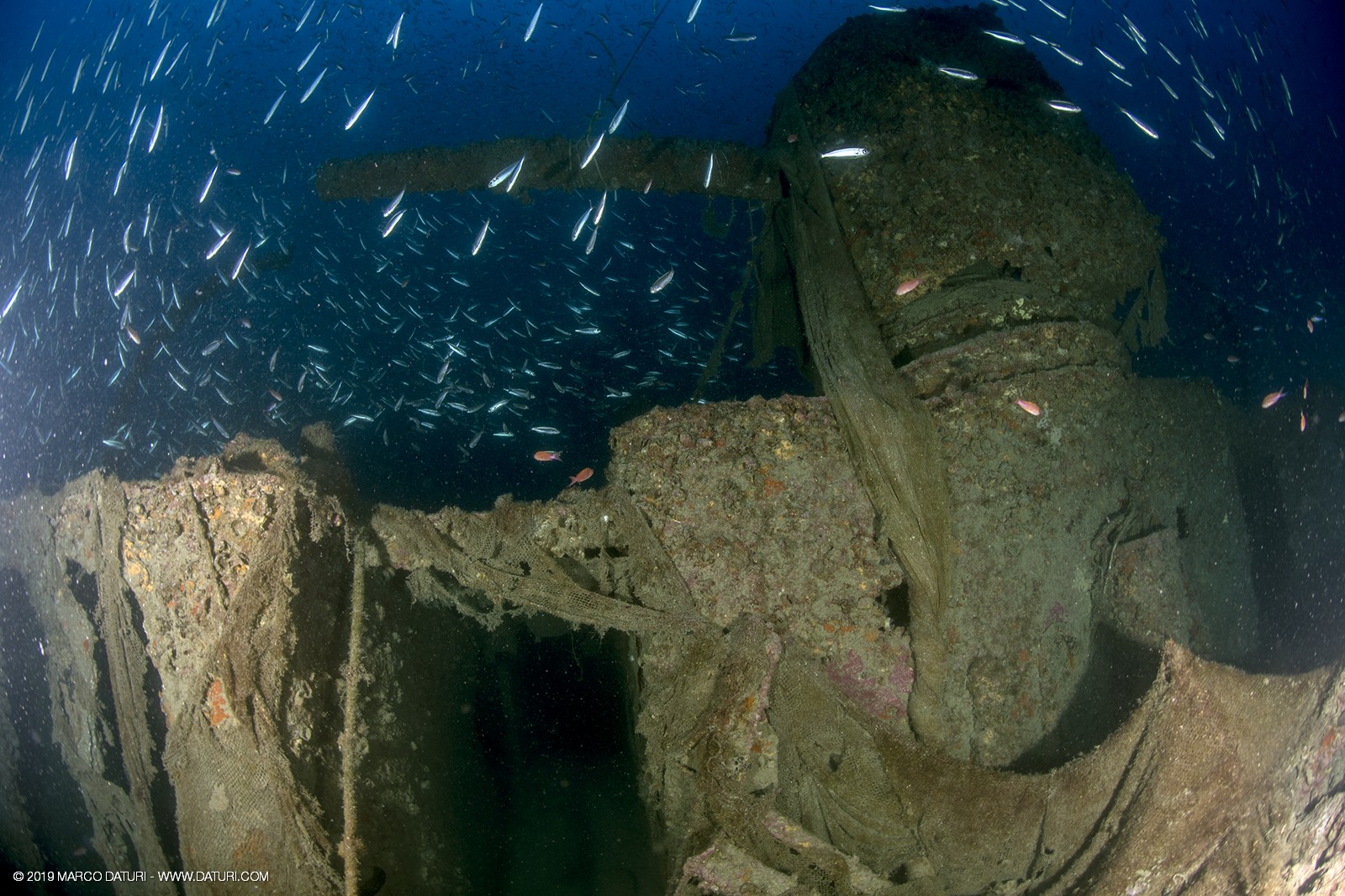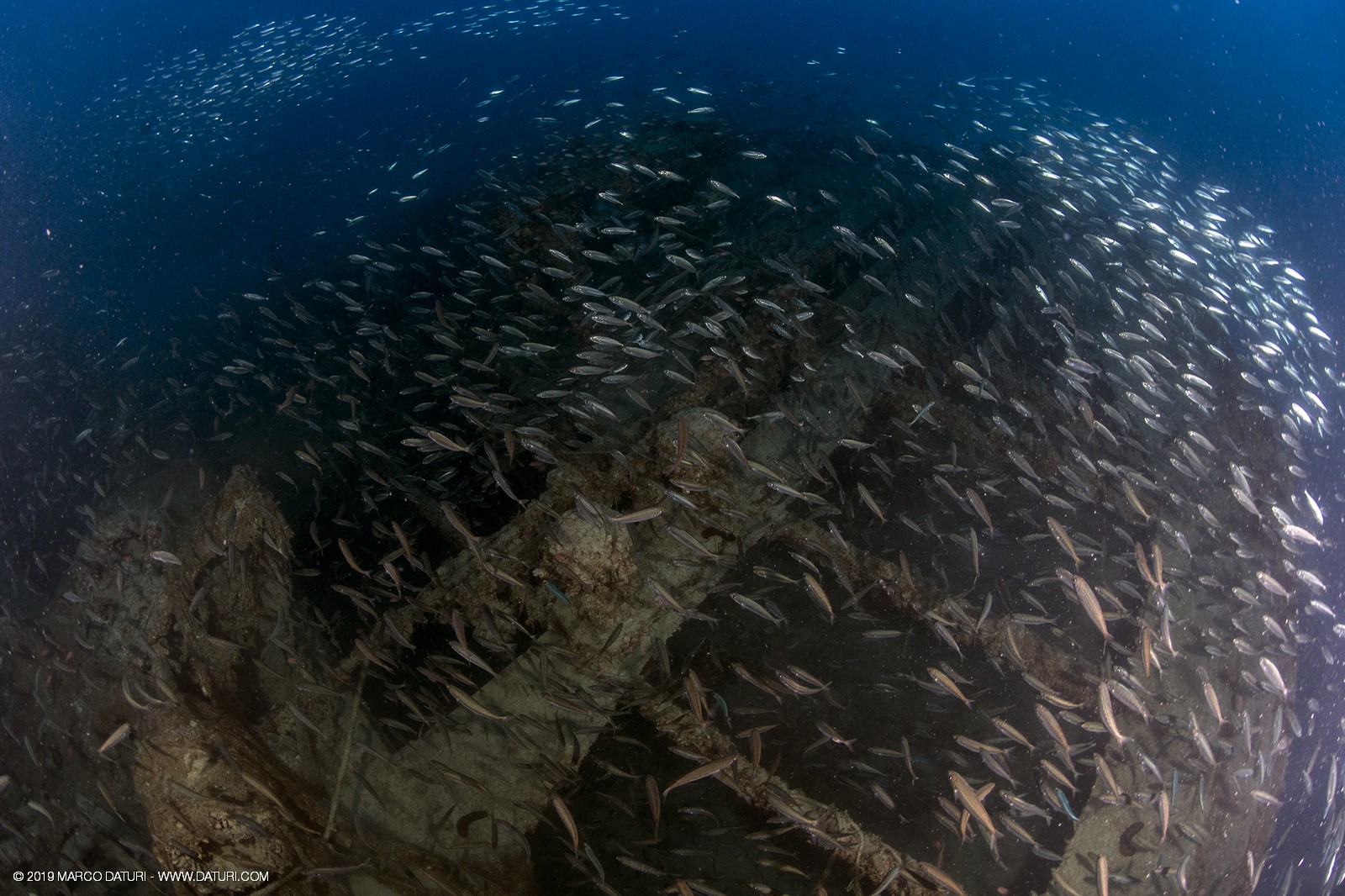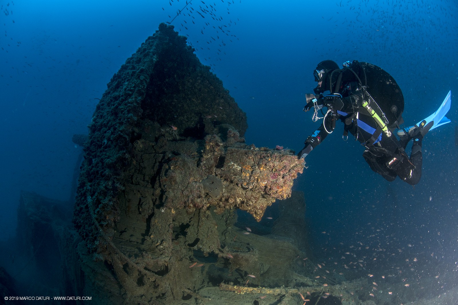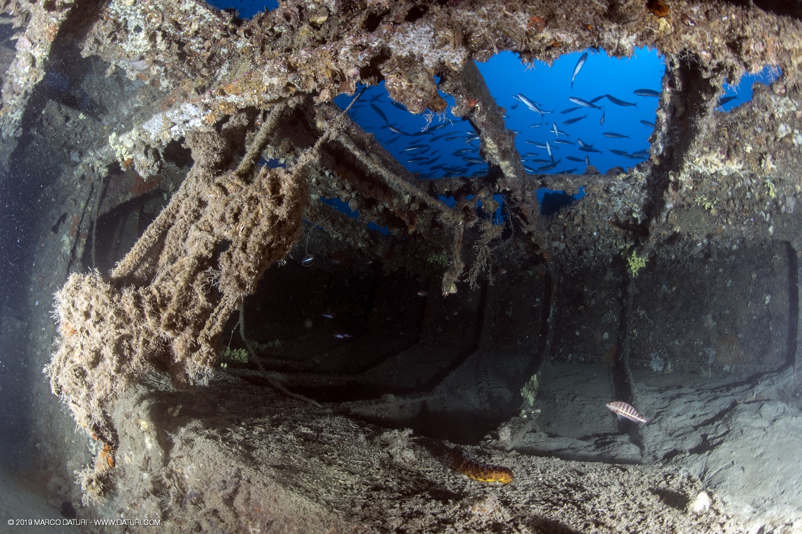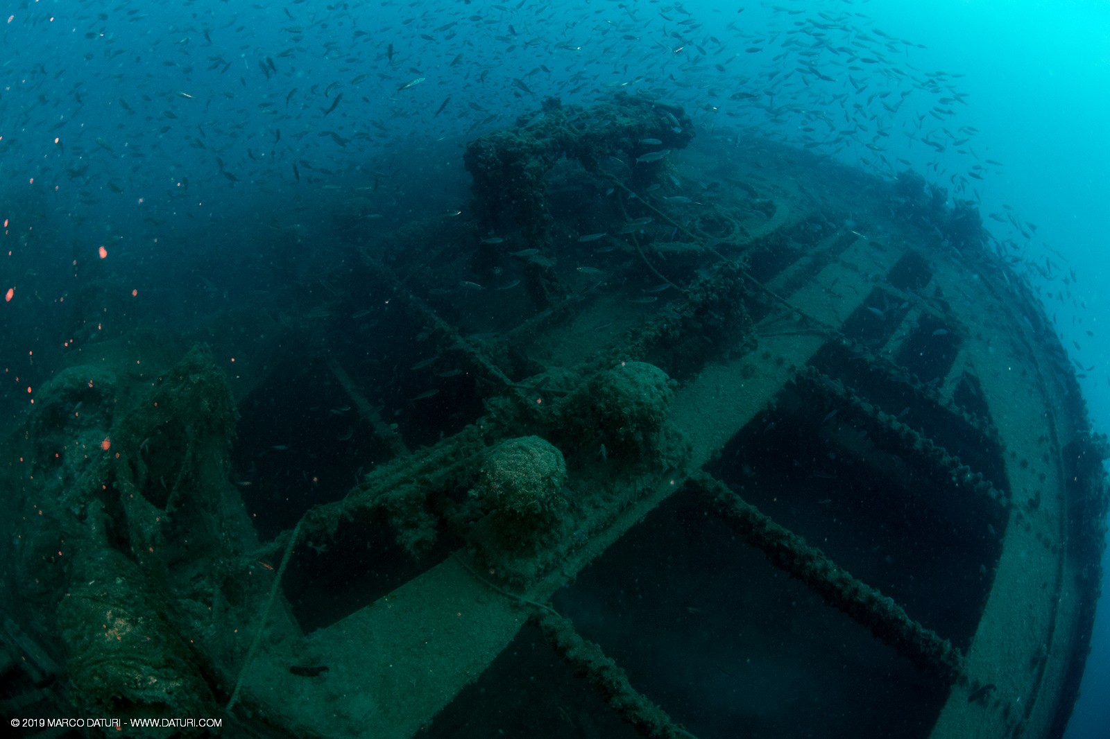 Il fascino di questo relitto distoglie l’attenzione dalla vita che ora lo anima: nuvole di anthias, murene, gronghi, aragoste, astici, nudibranchi, granchi facchino, c’è veramente di tutto!!