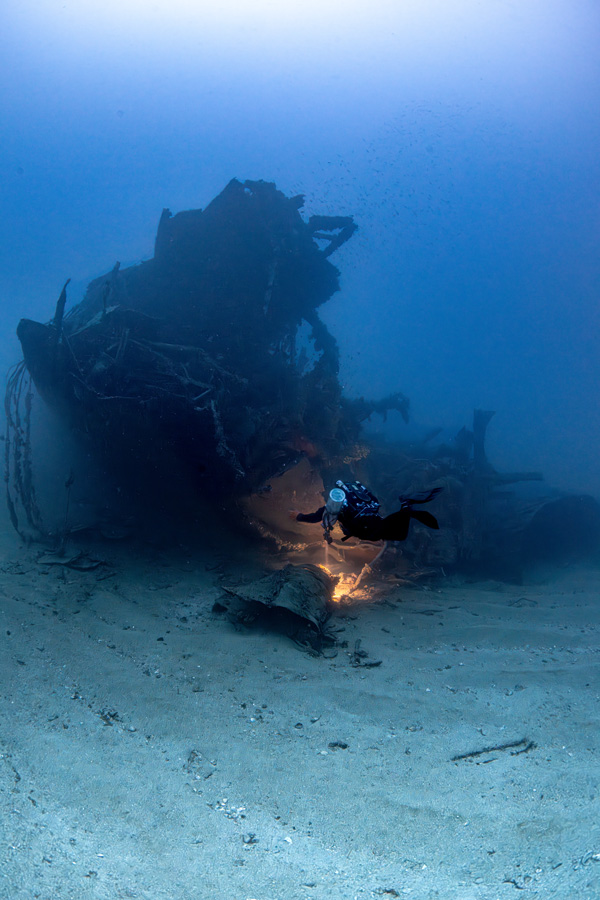 Dopo 3 minuti di discesa, arriviamo al relitto, dove ci dirigiamo immediatamente verso la parte posteriore del pezzo staccato. Diamo un’occhiata all’interno e facciamo le nostre esplorazioni. Come concordato in precedenza, Wim posizionerà delle luci in modo che il pezzo del relitto sia leggermente retroilluminato. Wow, il relitto è incredibilmente bello.