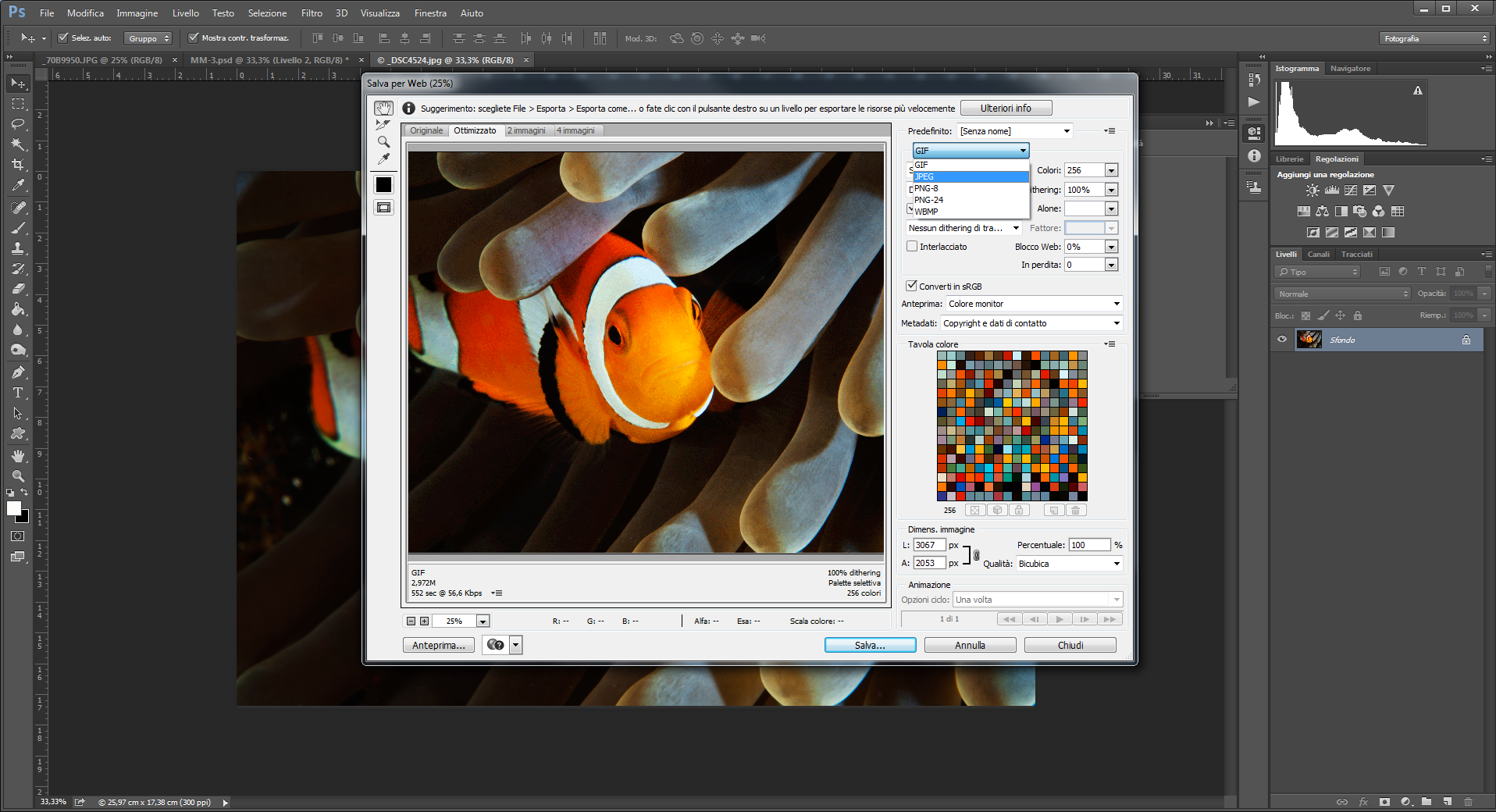 Nel caso del concorso di fotografia subacquea MyShot sono richiesti file JPG perciò nella finestra corrispondente dove selezioniamo il tipo di file scegliamo JPG.