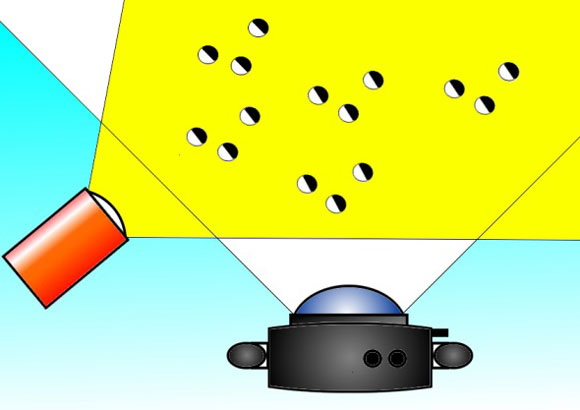 Per quanto riguarda la sospensione, in primo luogo sarà bene… non alzarla, avvicinandoci con cautela al punto di ripresa e cercando di farlo prima dei nostri compagni di immersione non fotografi, che non possono comprendere questa necessità. Il secondo suggerimento riguarda la luce del flash che, come ormai è spiegato da anni in tutti i sacri testi, deve essere angolata rispetto all’asse di ripresa dell’obiettivo. Perché il flash deve essere lontano e angolato? Per spiegare questo concetto mi rifarò al principio di funzionamento dei fari automobilistici cosiddetti "fendinebbia": questi sono posti normalmente vicini al fondo stradale, ciò perché il fascio di luce andrà a colpire la zona da vedere (la strada) senza illuminare le particelle acquose costituenti la nebbia poste tra gli occhi del guidatore e la strada stessa. In tal modo la luce riflessa dalla strada che raggiunge gli occhi del conducente illumina le particelle solo nel percorso di "ritorno" verso di essi. Con una illuminazione parallela o coassiale alla vista del guidatore, ad esempio con i fari "abbaglianti", il risultato sarà un muro bianco di particelle illuminate nel percorso di "andata" della luce. Questo principio si applica anche nel caso di illuminazione del flash angolato e distante dalla macchina fotografica, e spiega la necessità di utilizzare bracci più o meno lunghi ed articolati su cui applicare i lampeggiatori. In realtà quello che avviene non è esattamente come spiegato, una parte di sospensione inquadrata viene comunque illuminata dalla luce nel percorso di andata, solo che le particelle verranno illuminate parzialmente e saranno quindi meno visibili.