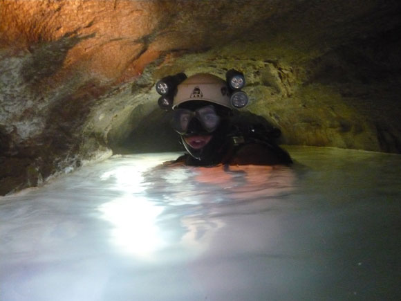 Abbiamo fatto una prima immersione raggiungendo un sifone aereo che arriva in una grande sala con un pozzo di circa 10 metri da cui scende una cascata; l’obiettivo di oggi è portare il materiale necessario per mettere in sicurezza la cascata e risalirla con la possibilità e l’augurio che vi sia una prosecuzione.