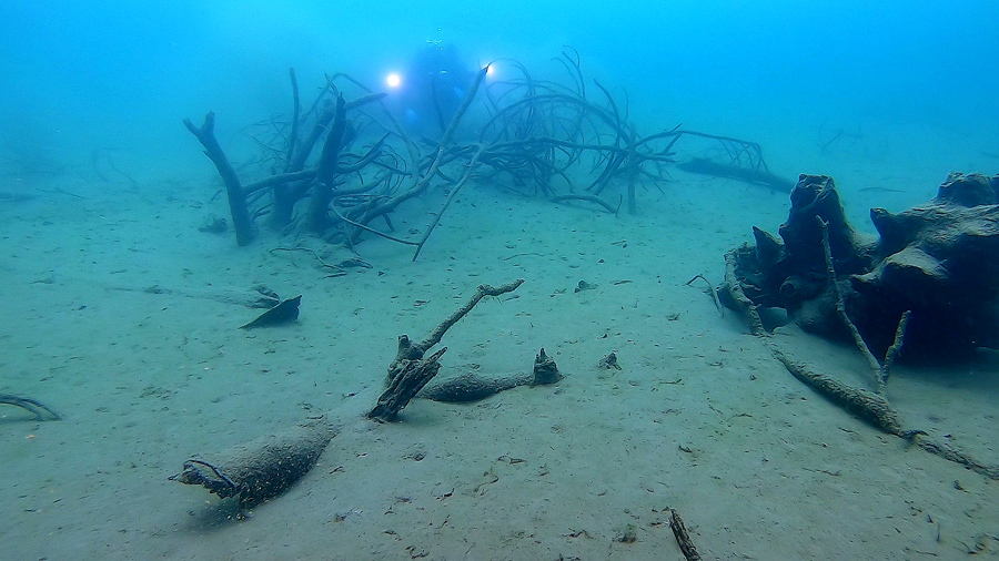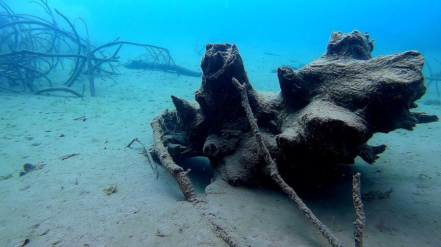 Intano Ivan navigava come fosse dentro a un luna park: davanti alle nostre maschere, procedendo in direzione nord/est dapprima appariva una sorta di distesa calma e fangosa, intervallata da strane forme simili ad anaconda, ma non essendo ancora in narcosi si vedevano vecchi relitti solitari di alberi e pini, scaraventati qui da chissà quale tempesta.