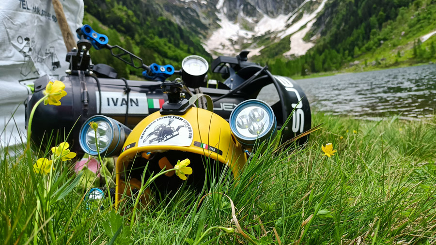 Le prime ad essere preparate, sono state le attrezzature subacquee, più pesanti, ingombranti e delicate: portavamo in quota in nostri affidabili scooter Suex perché eravamo intenzionati a perlustrare tutto il lago. Dentro un “elibag”, l’inarrestabile Marco aveva preparato ed inserito un robusto bancale di sottofondo a tutte le bombole e borse, mentre i nostri dpv erano posizionati nella parte superiore.
