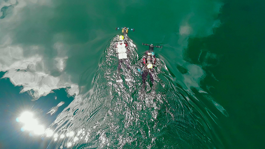 Intanto Ivan Rolli era già pronto: montato i faretti sui bracci fotografici dello scooter, sistemando l’angolazione di ripresa, monitorato la quasi perfetta visibilità in acqua, dopo aver supervisionato anche il mio dpv abbiamo dato inizio alle danze: “Rock’n roll gain “Toccava a noi volare, ma sott’acqua. Due tuffi di 80 e 20 minuti, alla temperatura minima di 6 gradi C ed alla max profondità di 13 metri: semplicemente bellissimi ed entusiasmanti, con una navigazione lunga oltre 1600 mt.