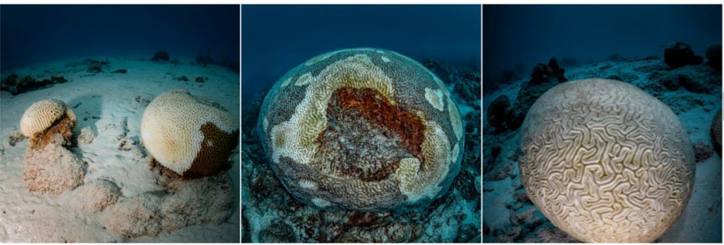 Immagini che mostrano tre stadi della Malattia da Perdita di Tessuto del Corallo Duro (SCTLD) che colpisce i coralli Cervello. La SCTLD progredisce rapidamente, causando la degradazione del tessuto e lasciando esposto lo scheletro del corallo man mano che la malattia avanza.