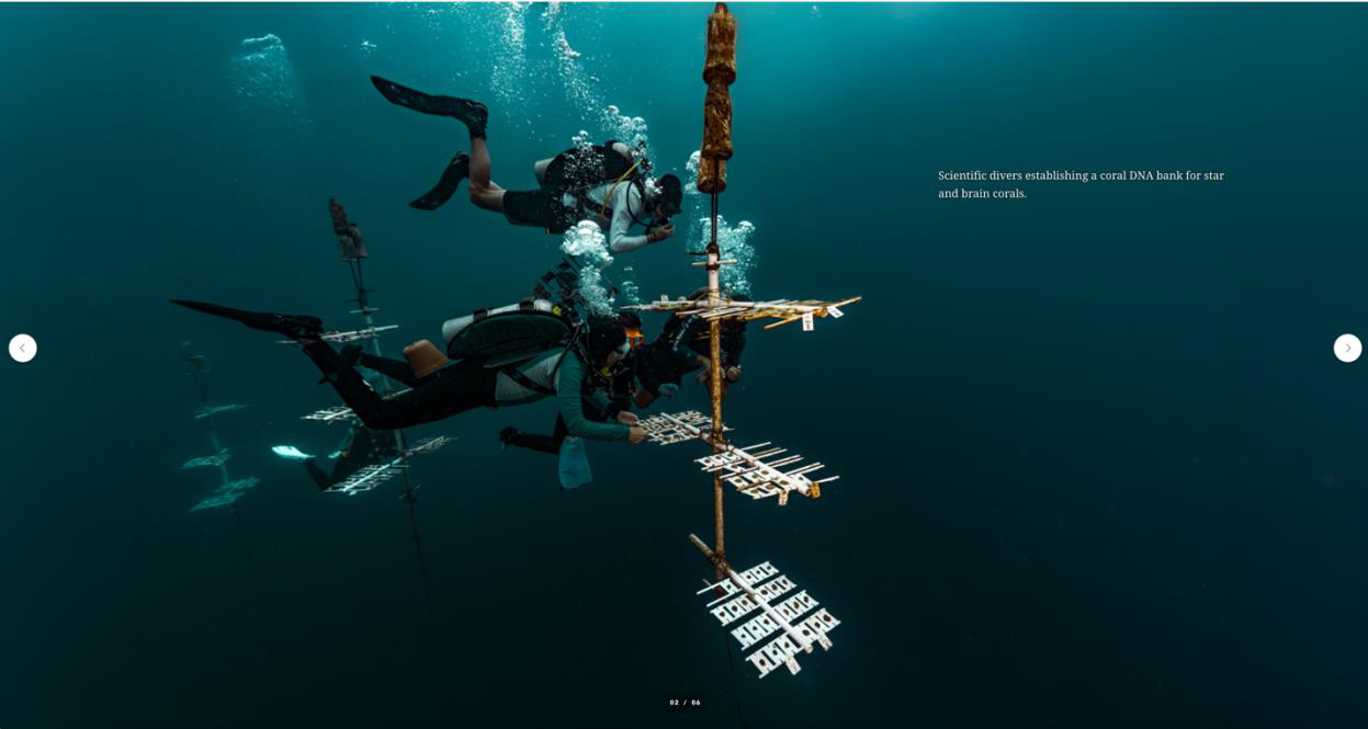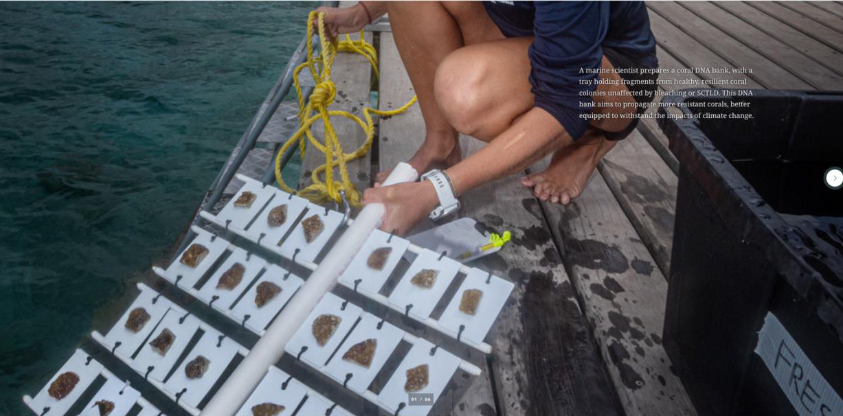 Uno biologo marino prepara una banca del DNA corallino, con un vassoio contenente frammenti di colonie di coralli sani e resilienti, non colpiti da sbiancamento o SCTLD. Ǫuesta banca del DNA ha l’obiettivo di propagare coralli più resistenti, meglio adattati a sopportare gli impatti del cambiamento climatico.