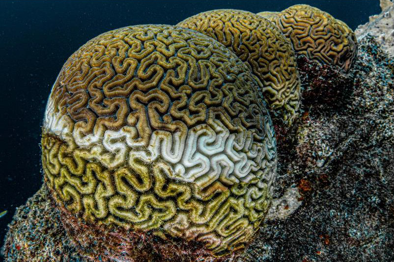 Il processo di sbiancamento del corallo Cervello inizia dalla base e si estende verso l’alto. I tre colori distinti indicano uno sbiancamento attivo nella parte centrale, mentre le alghe verdi hanno già invaso e soffocato la porzione inferiore. La parte superiore rimane ancora sana, ma rischia di sbiancarsi presto se le temperature non diminuiscono in modo significativo e rapido.