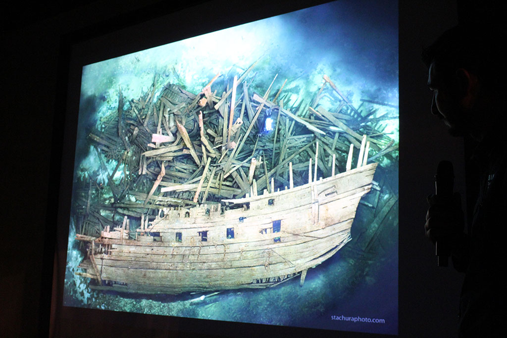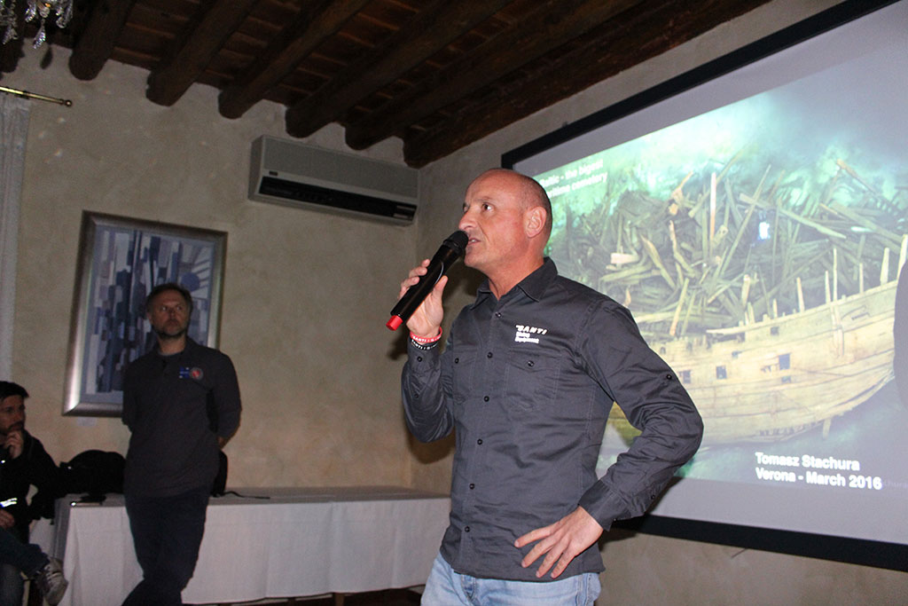 In serata, presso la sala eventi del Ristorante Enoteca “Bacco d’Oro”, di fronte ad un numeroso pubblico, Tomasz Stachura ha presentato la relazione video fotografica dal titolo “Baltic Sea – the biggest world underwater cemetery”, affascinanti storie di relitti sommersi nel Mar Baltico, un bacino d’acqua unico al mondo per le numerose navi che vi sono adagiate sul fondo. Tomasz ha conquistato la platea descrivendo le immersioni su vascelli in legno perfettamente conservati come il Mars e su altri relitti di alta valenza storica che testimoniano invece le vicende della seconda Guerra Mondiale come la Wilhelm Gustloff e la Graf Zeppelin.