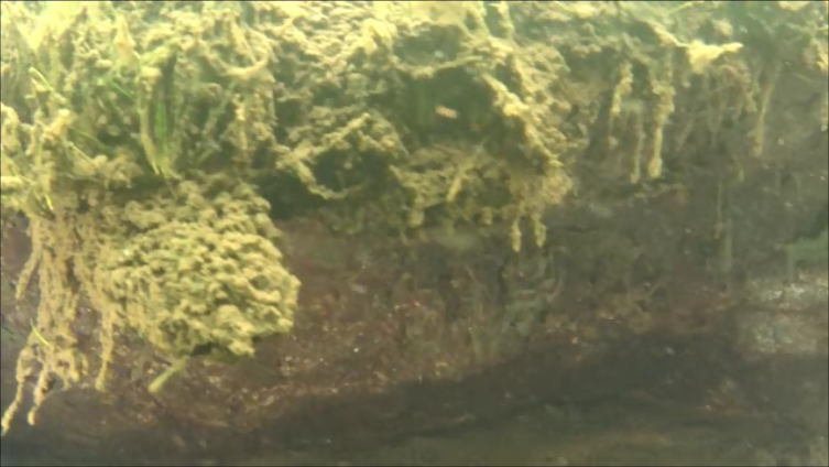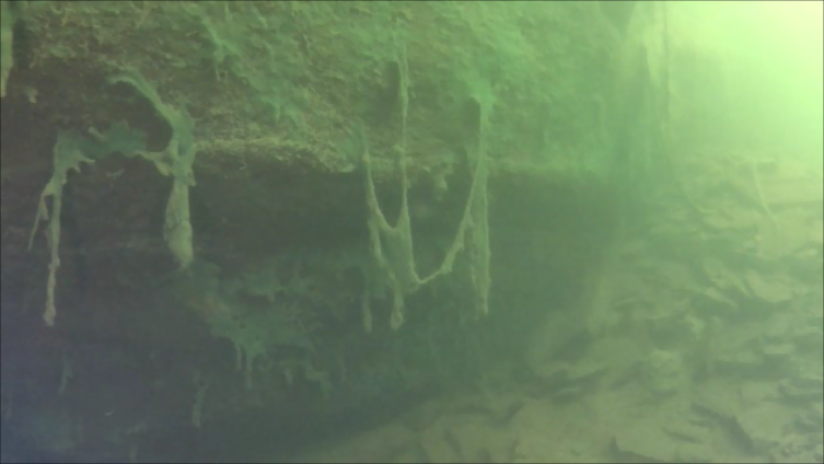 Questa volta però durante la navigazione, ci siamo soffermati su un aspetto particolare dell’ambiente lacustre subacqueo, osservando in particolar modo le alghe che vivono sul fondo , ma più ancora ,“ attaccate “ alla parete rocciosa esistente . Svolazzando in prossimità della prateria , al passaggio del DPV di Ivan , notavamo che una sorta di “pseudo mucillaggine “si sollevava dal fondo, come se fossero tanti piccoli fiocchi di alghe . Ancora più particolare e per noi curioso, è stato osservare la roccia della piccola paretina presente in senso longitudinale del lago. Infatti, la quasi totalità della roccia, era ricoperta da una specie di spessa pellicola… quasi un drappo o una tappezzeria spessa anche qualche millimetro, che anche al tocco del guanto , tendeva a rimanere integra.