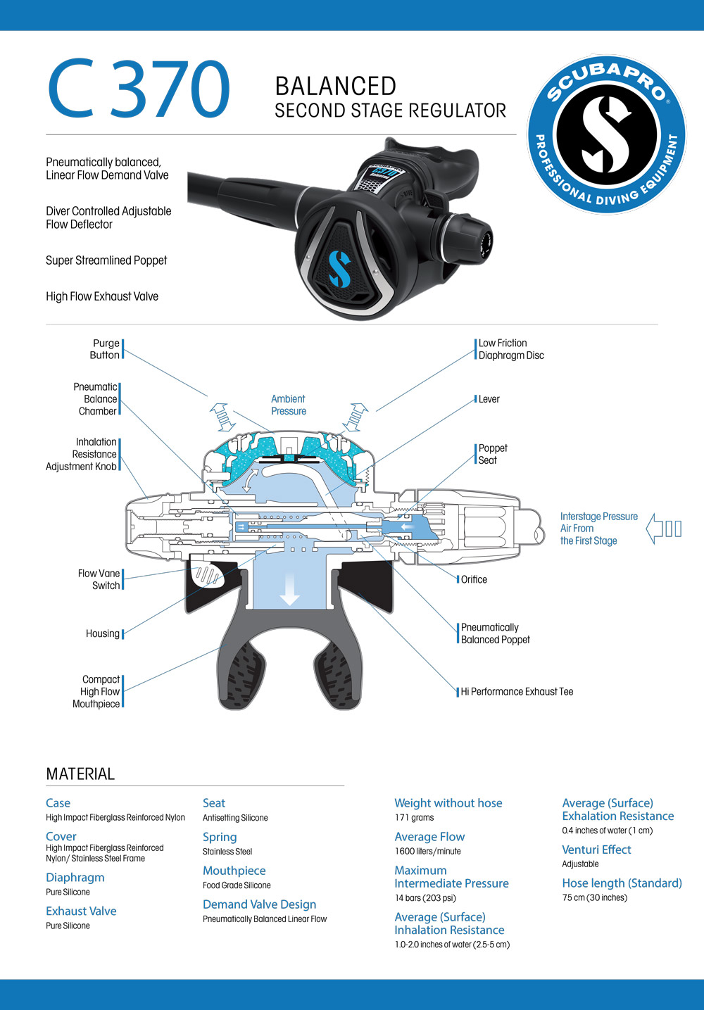 Il C370 è un erogatore compatto dalle dimensioni ridotte, ma potente quando si tratta di erogazione dell’aria. I suoi pratici comandi includono un pomolo di regolazione dello sforzo inspiratorio utilizzabile dal sub, una leva coassiale di dive/pre dive e un grande pulsante di spurgo facile da attivare.