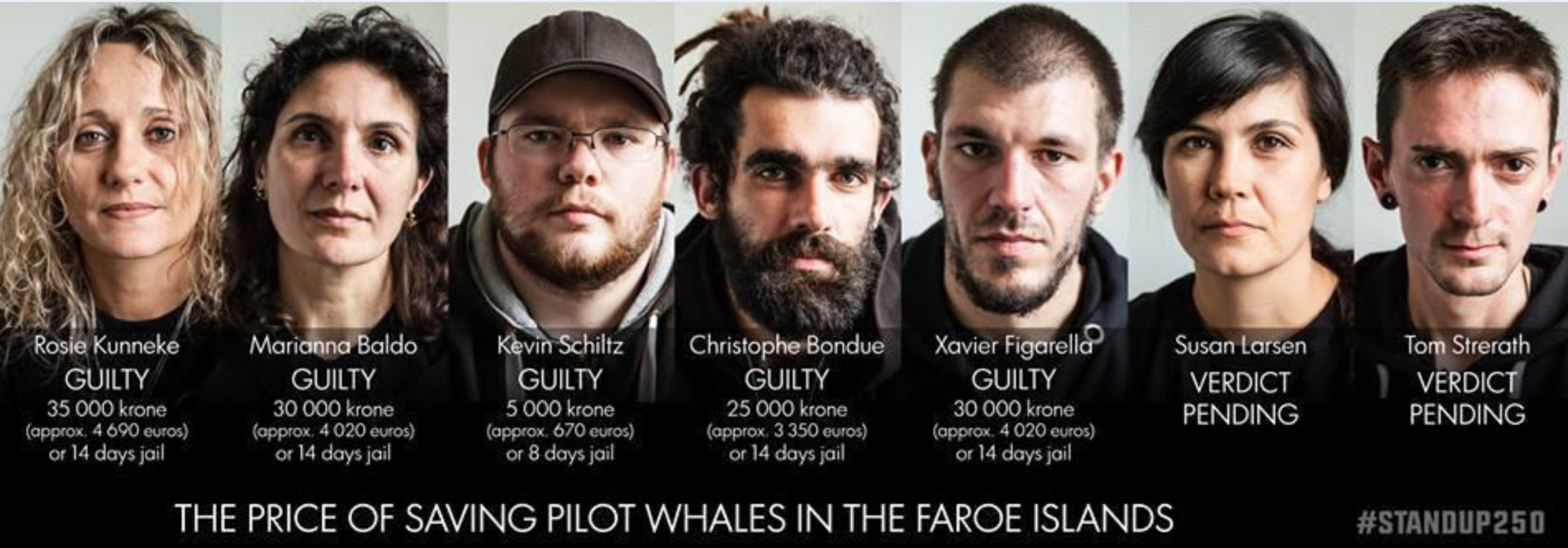 Dal 20 luglio nelle Isole Faroe sono stati arrestati in totale sette membri dell’equipaggio di Sea Shepherd, provenienti da sette paesi diversi. Tutti devono rispondere dell’accusa di aver violato la Legge che regola la caccia ai Globicefali.