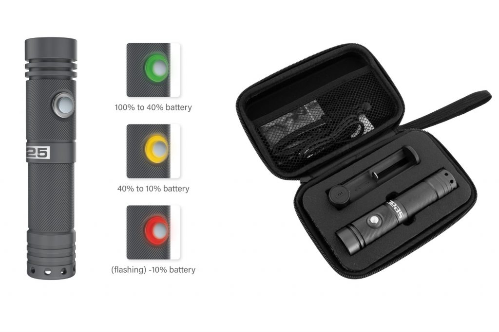 Il corpo in alluminio anodizzato, da 155 g, mantiene ingombri limitati: 130 millimetri di lunghezza e 29 millimetri di diametro. La batteria Li Ion integrata da 3450 mAh garantisce 3 ore di autonomia in modalità ridotta e 2 ore alla massima potenza. Il caricatore dedicato è incluso.