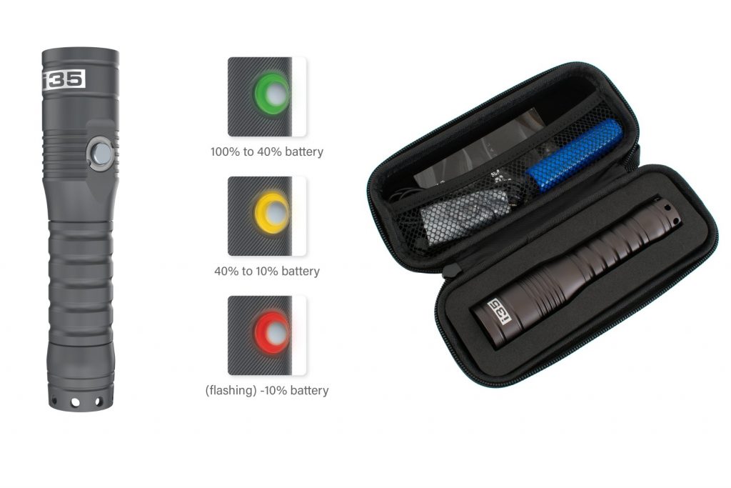 La i35 introduce un livello superiore di potenza e flessibilità. Il LED SST40 da 15 Watt genera 1500 lumen con un fascio da 12 gradi, una soluzione che favorisce la visibilità a media distanza, utile in acque torbide o per percorsi all’interno di relitti e ambienti con scarsa luce naturale.