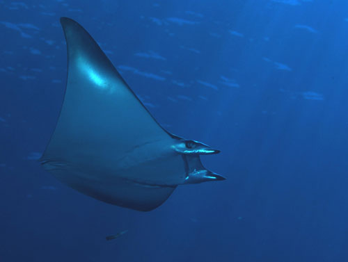 Ci prepariamo e siamo finalmente in acqua. Ci immergiamo su un pinnacolo di granito non molto profondo, l’acqua è limpida ed azzurra. Al nostro ingresso in acqua un banco di platax si avvicina incuriosito, sono centinaia, passiamo attraverso il banco incrociando i loro occhi e scendiamo… le rocce di granito sono ricche di coralli molli multicolori ma anche di coralli duri tra i quali si nascondono pesci corallini di varie specie. Sulla sabbia incontriamo il nostro primo squalo pinna bianca, è piccolo e timido ma riusciamo ad osservarlo bene, e due trigoni semisepolti sotto la sabbia che si concedono volentieri ai fotografi. Mentre ritorniamo verso la superficie veniamo avvolti da una nube di fucilieri, tanti da nasconderci la vista dei compagni. Ma è ora di riemergere, senza che ce ne accorgessimo siamo in acqua da 54 minuti.