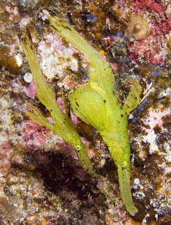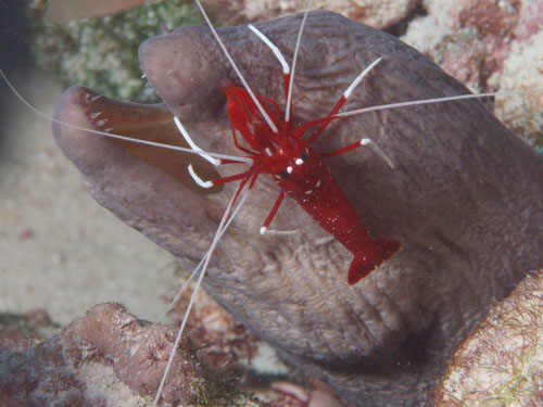 Oggi Charles ci ha promesso delle immersioni speciali, durante il briefing ci informa che il luogo che vedremo è un fragile ecosistema e, quindi, non useremo l’ancora, ci invita inoltre ad essere molto attenti col nostro assetto e macchine fotografiche. Cominciamo la nostra discesa, le roccie sono ricoperte di coralli molli di ogni colore, fragili madrepore ed una microfauna incredibile. In tutti gli anfratti si scoprono numerose stazioni di pulizia tenute ordinatamente da gamberi del genere Lysmata e Stenopus. Troviamo una grossa cernia che si fa ripulire i denti, ma poco più in là anche un trigone ottiene gli stessi servizi. Gamberi, granchi e nudibranchi, tanti e di tante specie diverse, per la gioia degli intenditori. Noto un piccolo pesce foglia verde-oro che ondeggia e cerca di passare inosservato quando mi avvicino, ma poco più in là ce ne sono altri due, bianchi questa volta poggiati su una spugna. Sento un richiamo, un enorme squalo chitarra ci passa accanto. E’ un attimo, non siamo nemmeno sicuri che sia reale, ma era veramente bellissimo. Charles ci dice che è stanziale e si vede abbastanza spesso qui, anche se le sue apparizioni sono sempre molto veloci.