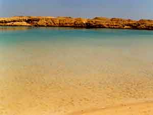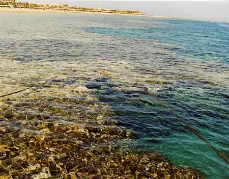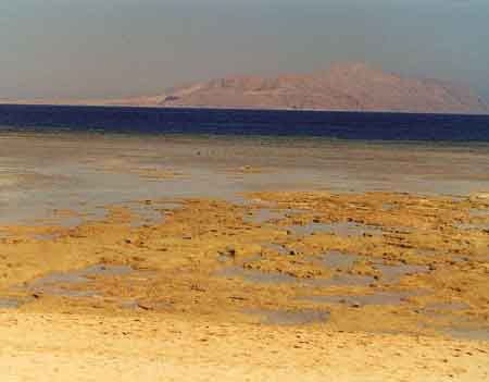 La mattina, fino alle ore 14, la bassa marea fa affiorare quai totalmente la barriera corallina. Sollo sfondo si può vedere l’isola di Tiran.