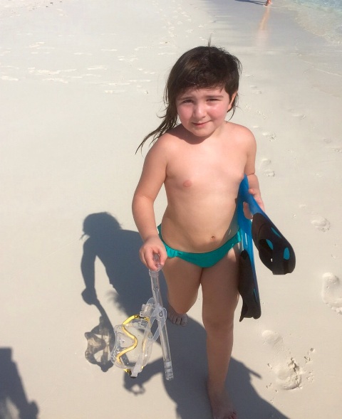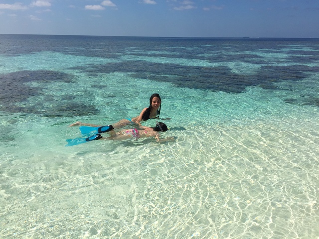 Il suo primo giorno in terra maldiviana è stato soprattutto di acclimatamento. Caldo, sole, acqua trasparente che lascia intravedere i pesciolini. Ma di mettere la maschera non se ne parla neanche. Eppure prima di partire aveva voluto in tutti i modi pinne, maschera e snorkel personali e comprati apposta per lei. Come è indispensabile fare sempre, ma a maggior ragione per un bambino. La difficoltà legata, per esempio, ad una maschera che si riempie d’acqua potrebbe causare un rifiuto totale dello snorkeling nel bambino, così come una pinna stretta che fa venire i crampi.