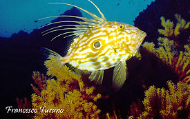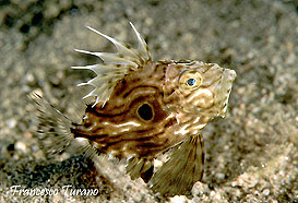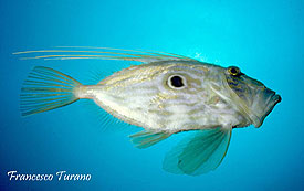 Sulla linea mediana del ventre si trova tutta una serie di scudetti ossei spinosi, con le punte dirette all’indietro. La pinna dorsale ha la prima porzione formata da raggi spinosi molto robusti, veri e propri aculei, con una spina basale da ogni lato; la membrana interradiale, quella posta cioè tra un raggio e l’altro della pinna, si prolunga invece in sottili filamenti, tanto maggiori quanto è più giovane l’esemplare. Quest’aspetto mi ha incuriosito più di altri nell’osservazione diretta di tali pesci ed ho notato, attraverso le mie immagini, delle differenze sulla morfologia delle pinne e della dorsale in particolare, con filamenti diversi, più o meno lunghi secondo l’età del pesce.